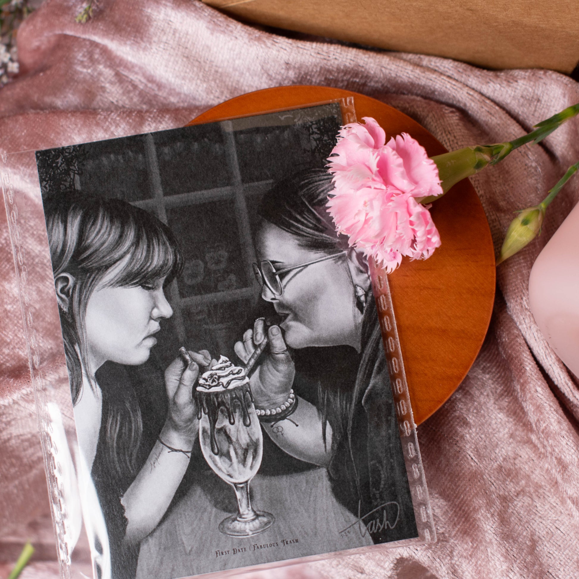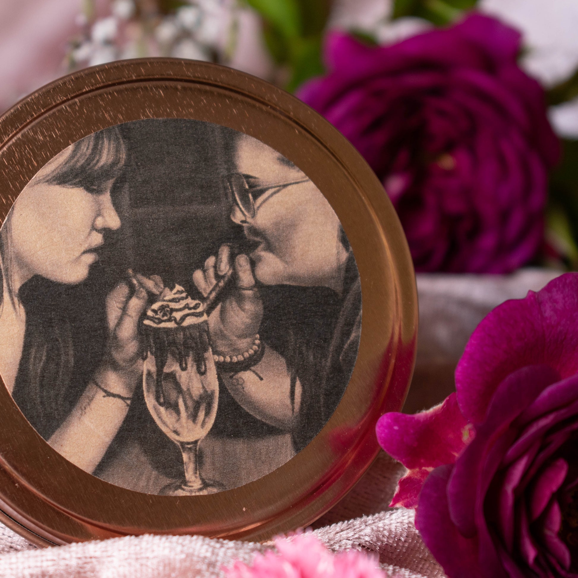 The artwork honors Sapphic love, depicting two women adorned with countless symbols including the 'sapphic' and double Venus tattoos. This candle smells like sharing a milkshake at a local cafe, as depicted in the accompanying artwork. The wax has been sculpted to resemble a decadent milkshake topped with a caramel drizzle and crumble.